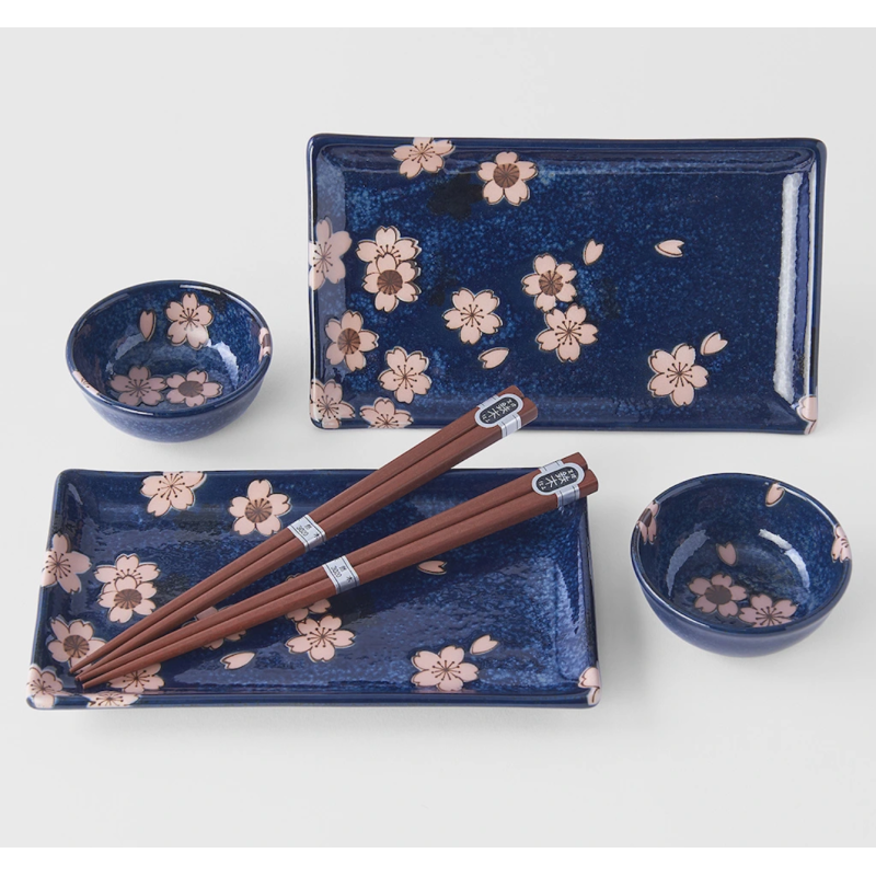 Set de sushi azul con flores sakura rosa